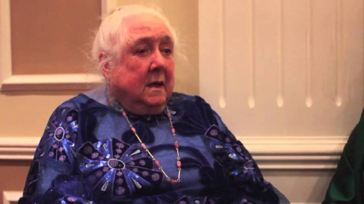 Professor Lalage Bown recites a poem at a party in July 2015.